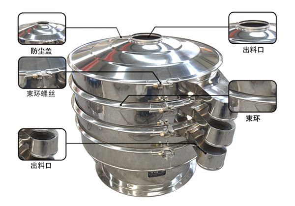 篩網,網架,加重塊,彈簧,出料口,束環,防塵蓋,進料口,機座等結構組成