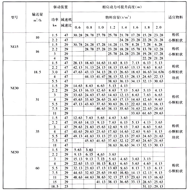 NE系列板鏈式提升機由運行部件、驅動裝置、上部裝置、中部機殼、下部裝置組成。運行部件-由料斗和專用板式鏈條組成,NE30及以下采用單排鏈,NE50-NE800采用雙排鏈。驅動裝置-采用多種驅動組合驅動,(依用戶實際需要而定)。驅動平臺上裝有檢修架和欄桿。驅動裝置分左和右裝兩種。上部裝置安裝有軌道(雙排鏈)、逆止器、卸料口裝有防回料橡膠板。中間節-部分中間節裝有軌道(雙鏈),以防止鏈條工作中擺動。下部裝置-安裝有自動張緊。
